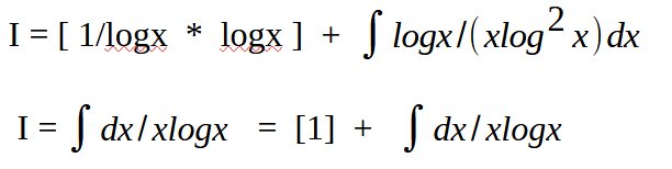 on pose u = 1 / logx et v’ = dx/x , ce qui nous permet de faire une intégration par partie (avec u’ = – 1/(xlog2x) et v = logx)