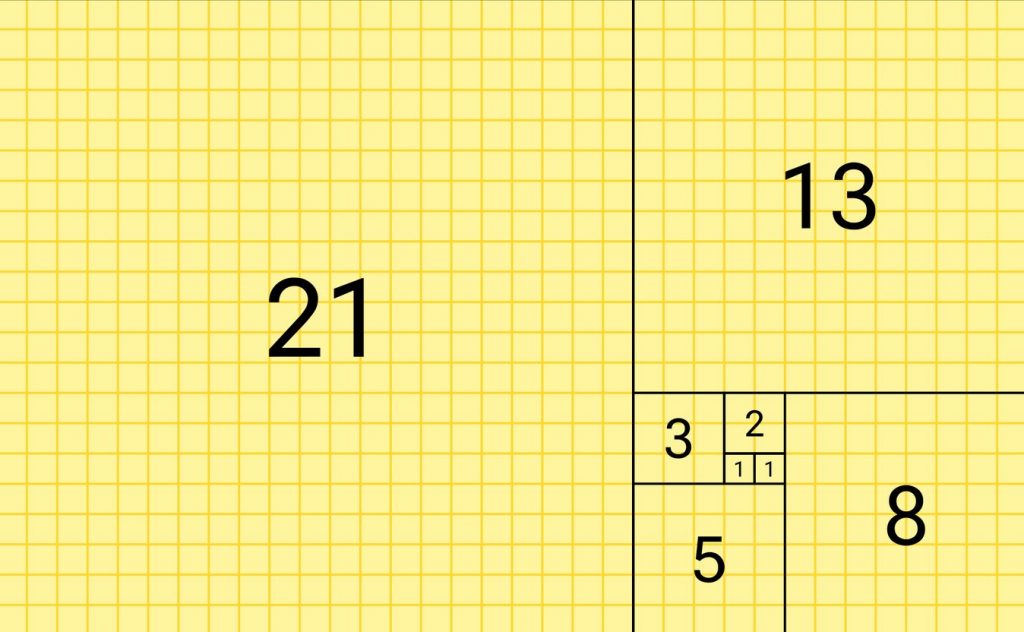 Dans un 1er temps, nous allons dessiner une juxtaposition de carrés dont les côtés ont pour longueur les nombres successifs de la suite de Fibonacci : 1, 1, 2, 3, 5, 8, 13 et 21.