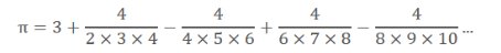 On part de 3, puis alternance des signes + et – avec division du chiffre 4 par les valeurs n*(n+1)*(n+2) ; plus particulièrement la valeur de n pour chacune des divisions correspond successivement aux nombres pairs. Pour être plus précis, on divise le chiffre 4 par les valeurs successives 2n*(2n+1)*(2n+2) pour n entier strictement positif.