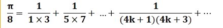 Donc π/4 = arctg(1) = 1 – 1/3 + 1/5 – 1/7 + 1/9 – 1/11 + 1/13 – 1/15 + …